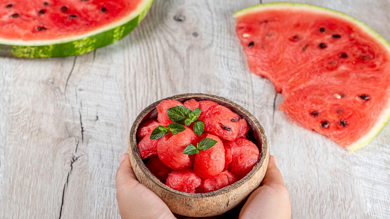 Обои Сладкая мякоть арбуза в миске на белом фоне