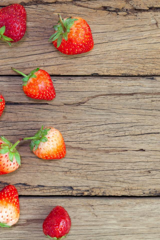 Обои Спелая красная клубника лежит на деревянном столе