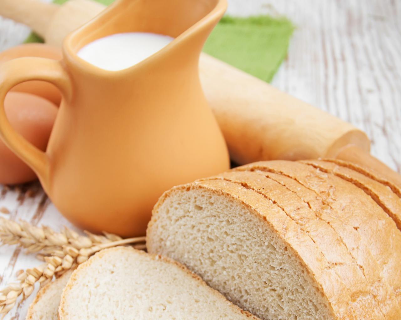 Обои Белый нарезанный батон на столе с молоком