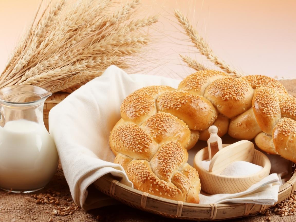 Обои Хлебобулочное изделие и кувшин молока на столе