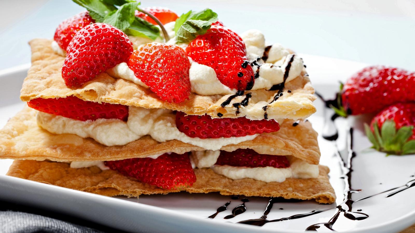 Обои Выпечка с творожным кремом и свежими ягодами клубники