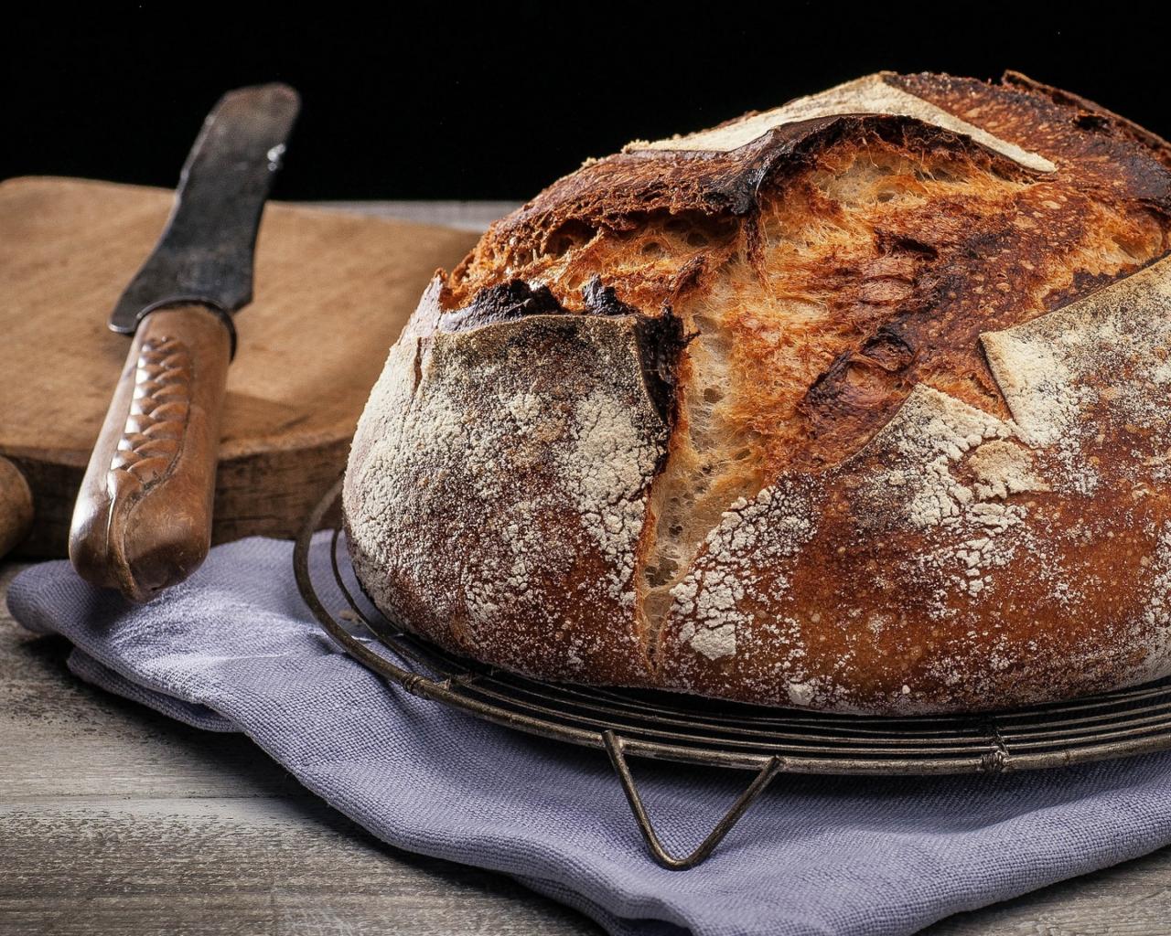 Обои Зажареный круглый хлеб на столе с ножом