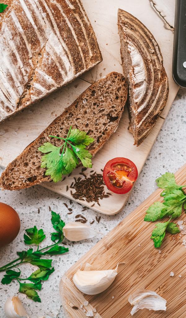 Обои Ржаной хлеб на столе с помидорами и специями