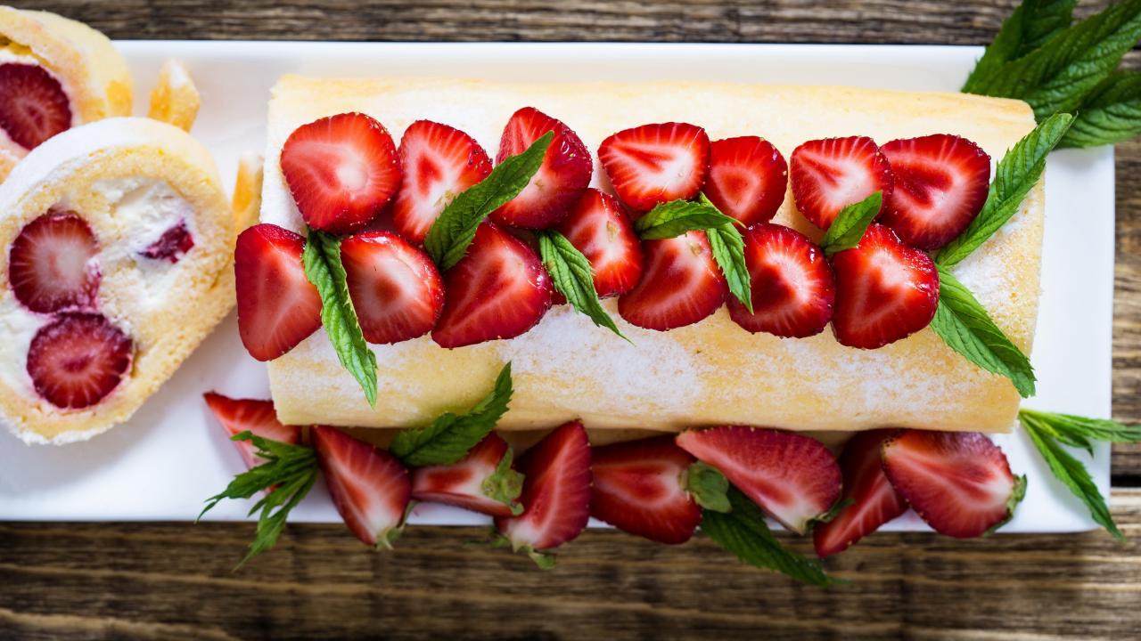 Обои Сладкий сливочный рулет со свежей клубникой