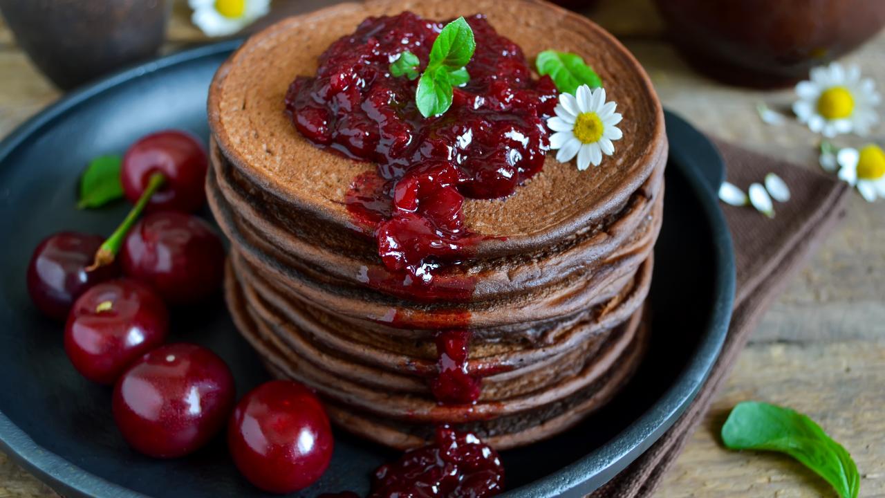 Обои Аппетитные панкейки с джемом и ягодами клубники