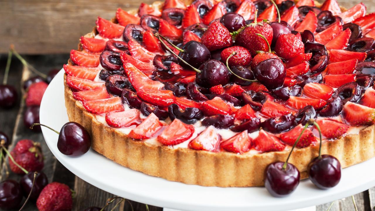 Обои Пирог со свежей аппетитной клубникой и вишней