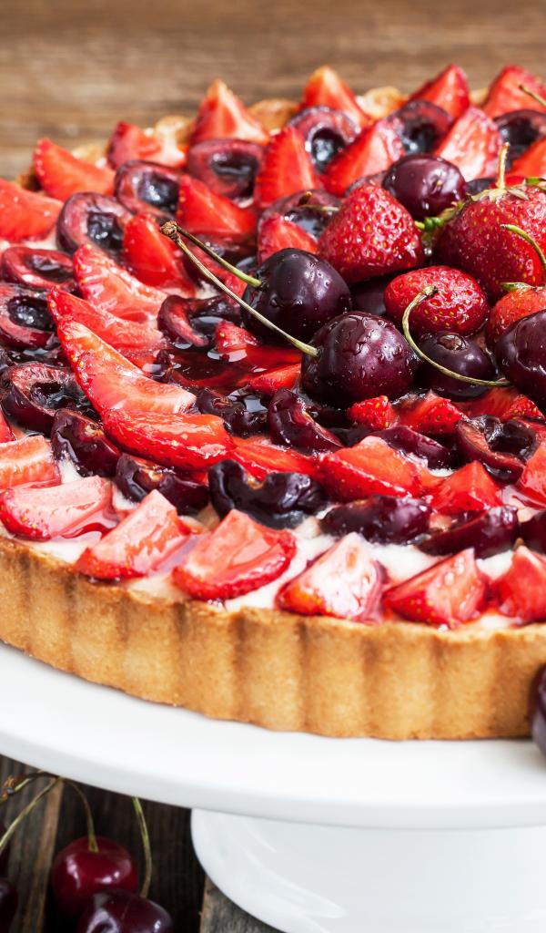 Обои Пирог со свежей аппетитной клубникой и вишней