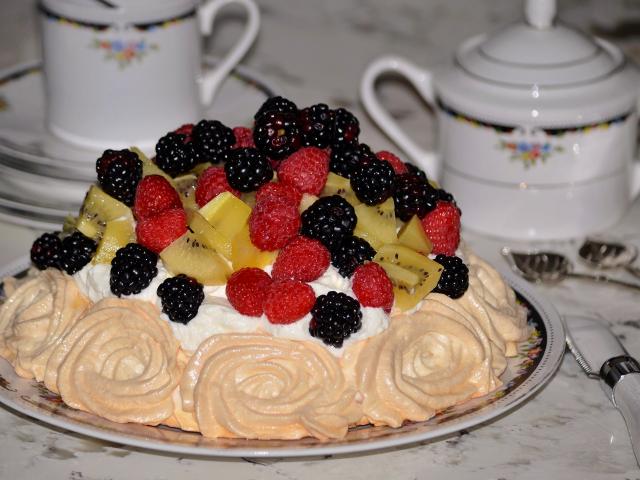 Обои Торт с безе и свежими ягодами на столе