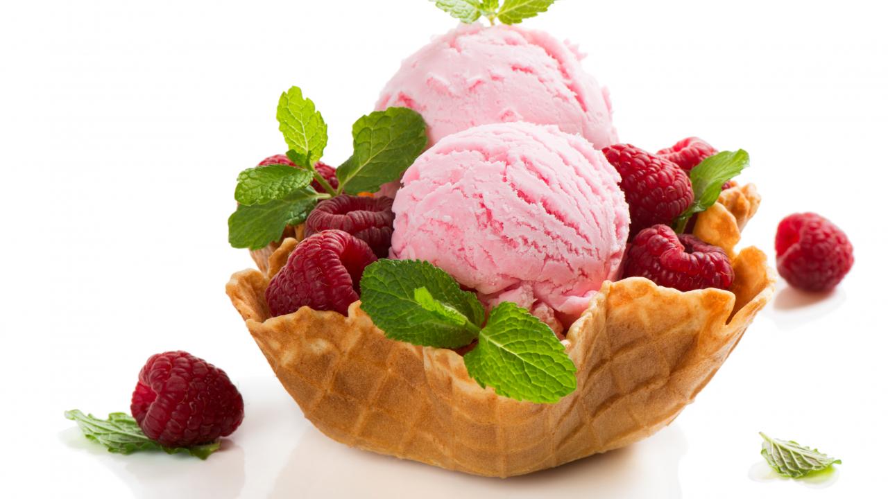 Обои Малиновое мороженое с ягодами в вафельной корзинке