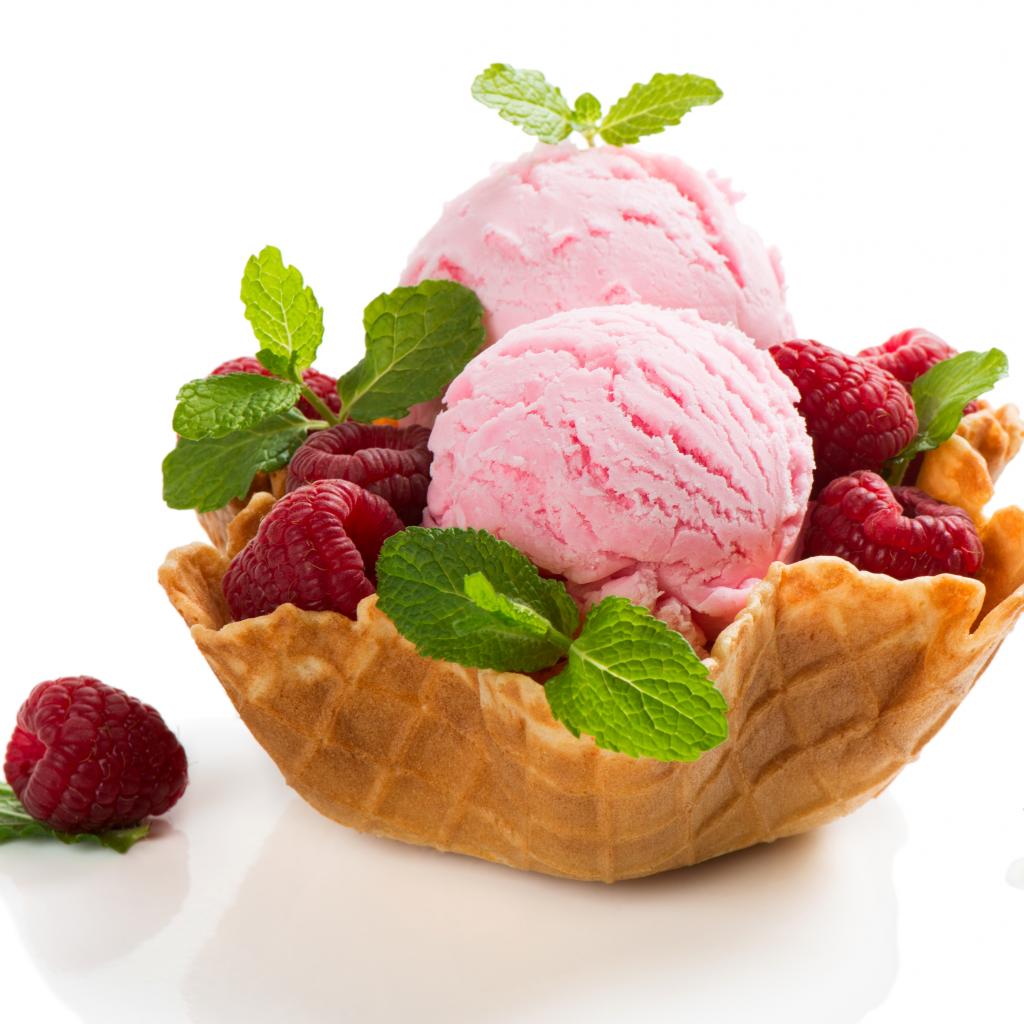 Обои Малиновое мороженое с ягодами в вафельной корзинке