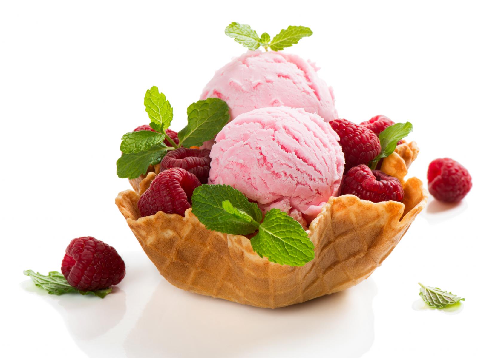 Обои Малиновое мороженое с ягодами в вафельной корзинке