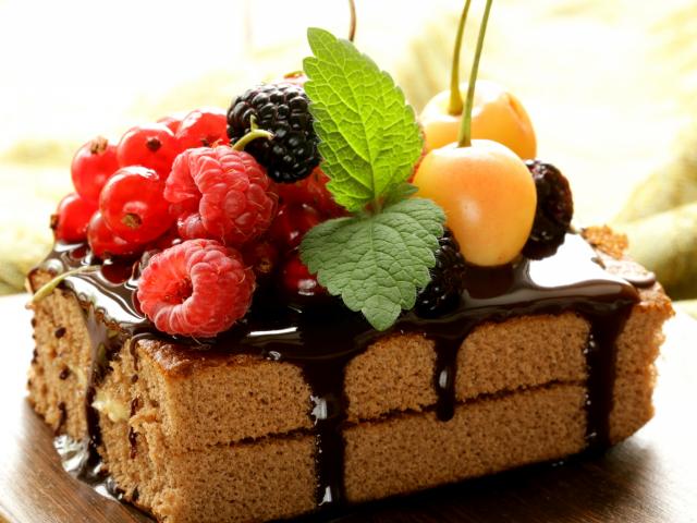 Обои Кусок пирожного с шоколадом и свежими ягодами