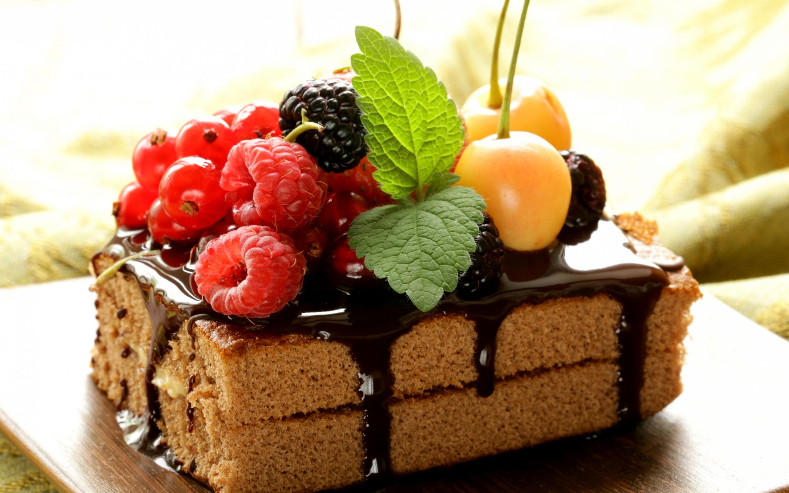 Обои Кусок пирожного с шоколадом и свежими ягодами