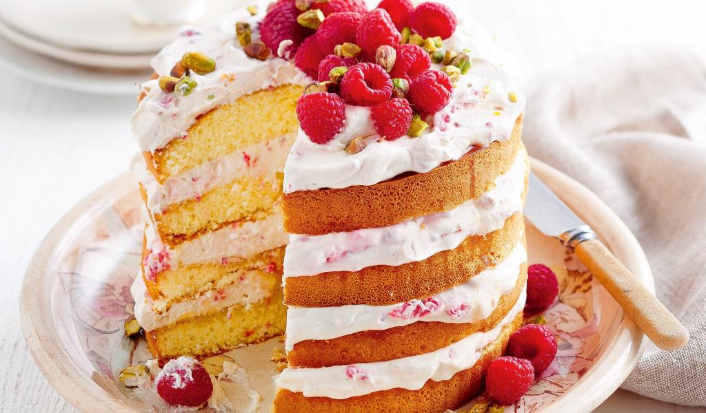Обои Большой торт со свежей малиной и фисташками