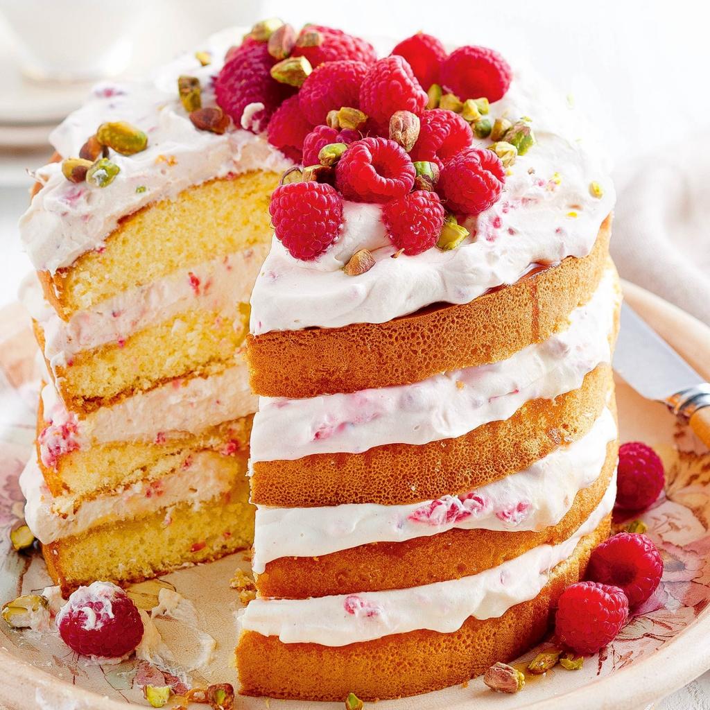Обои Большой торт со свежей малиной и фисташками