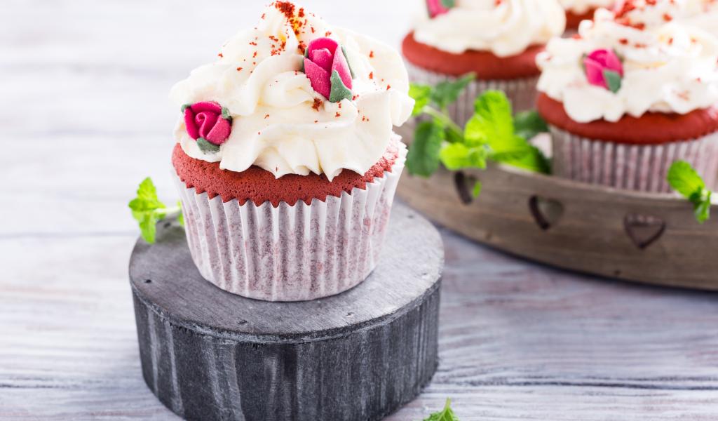 Обои Шоколадный капкейк с кремом и розочками на столе