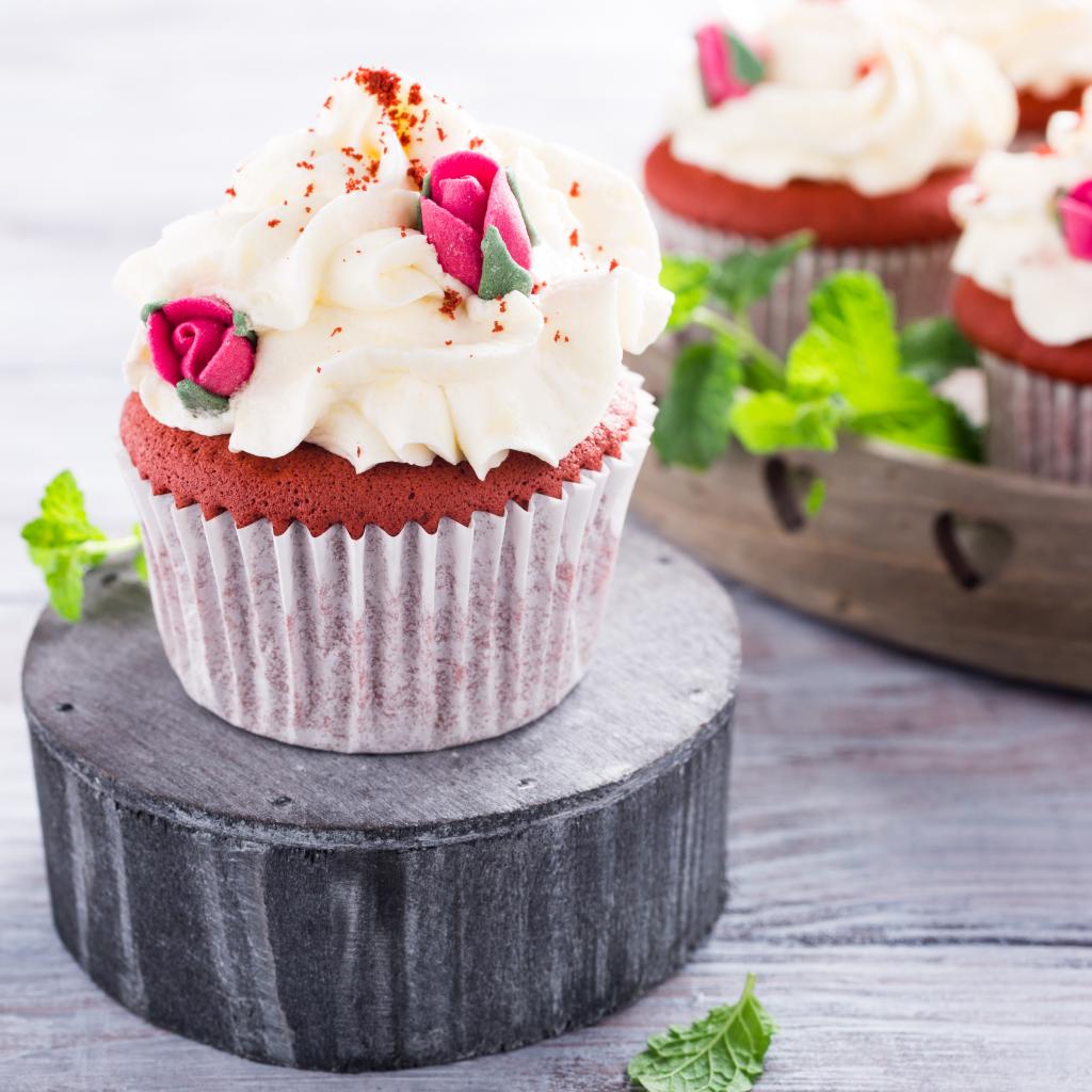 Обои Шоколадный капкейк с кремом и розочками на столе
