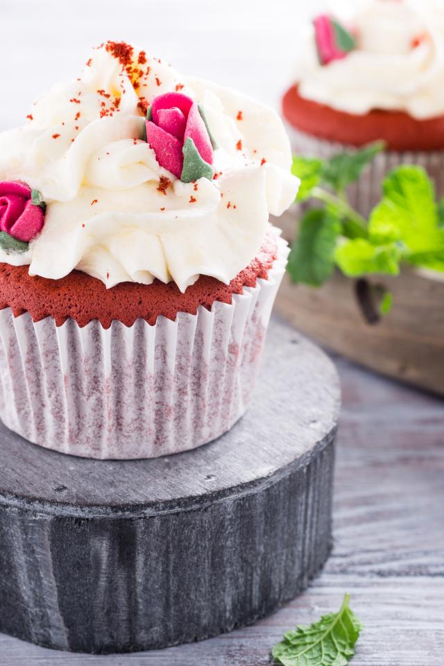 Обои Шоколадный капкейк с кремом и розочками на столе