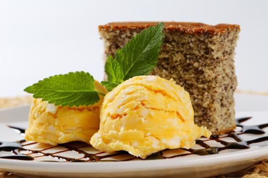 Обои Два шарика фруктового мороженого с кусочком пирога