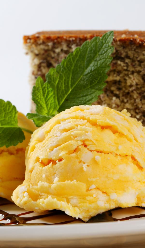 Обои Два шарика фруктового мороженого с кусочком пирога