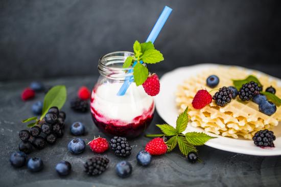 Обои Тонкие хрустящие вафли на столе с ягодами и коктейлем