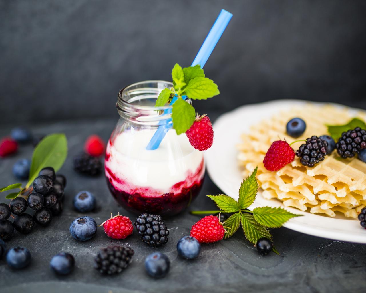 Обои Тонкие хрустящие вафли на столе с ягодами и коктейлем
