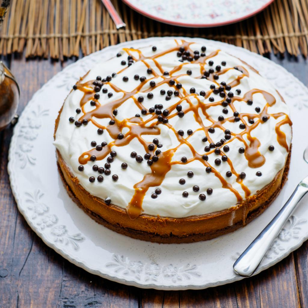 Обои Аппетитный пирог со сливками на белом блюде