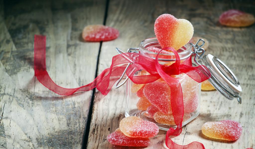 Обои Мармеладные конфеты в форме сердца в стеклянной банке