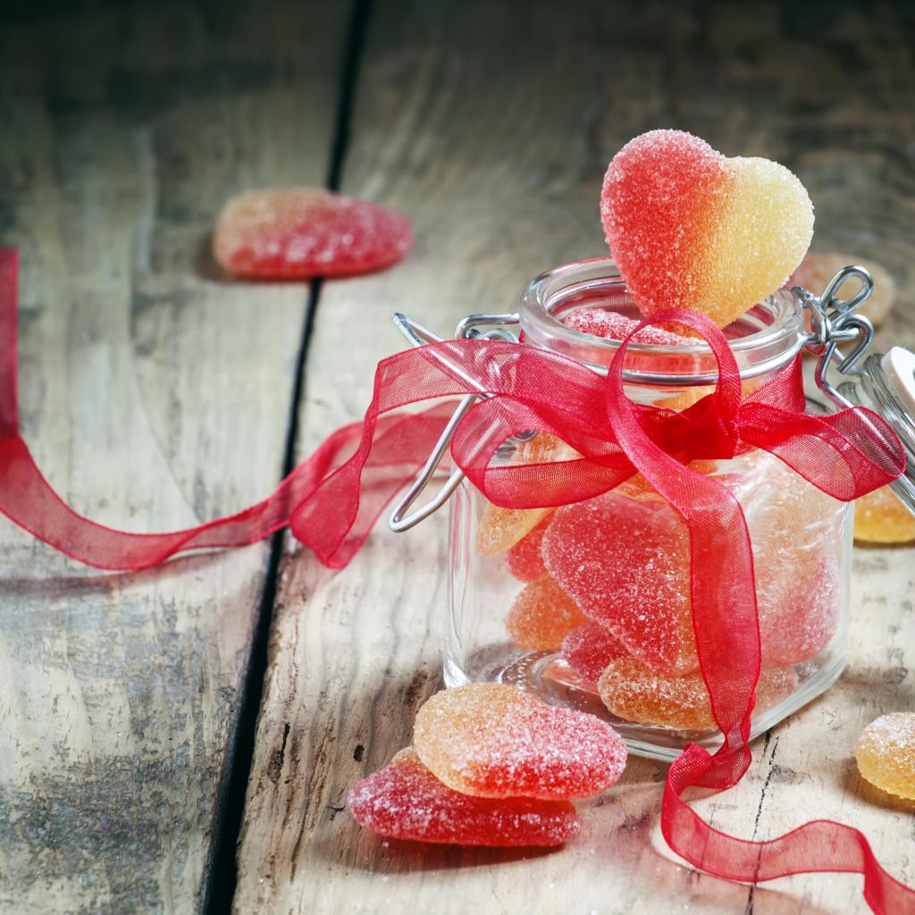Обои Мармеладные конфеты в форме сердца в стеклянной банке