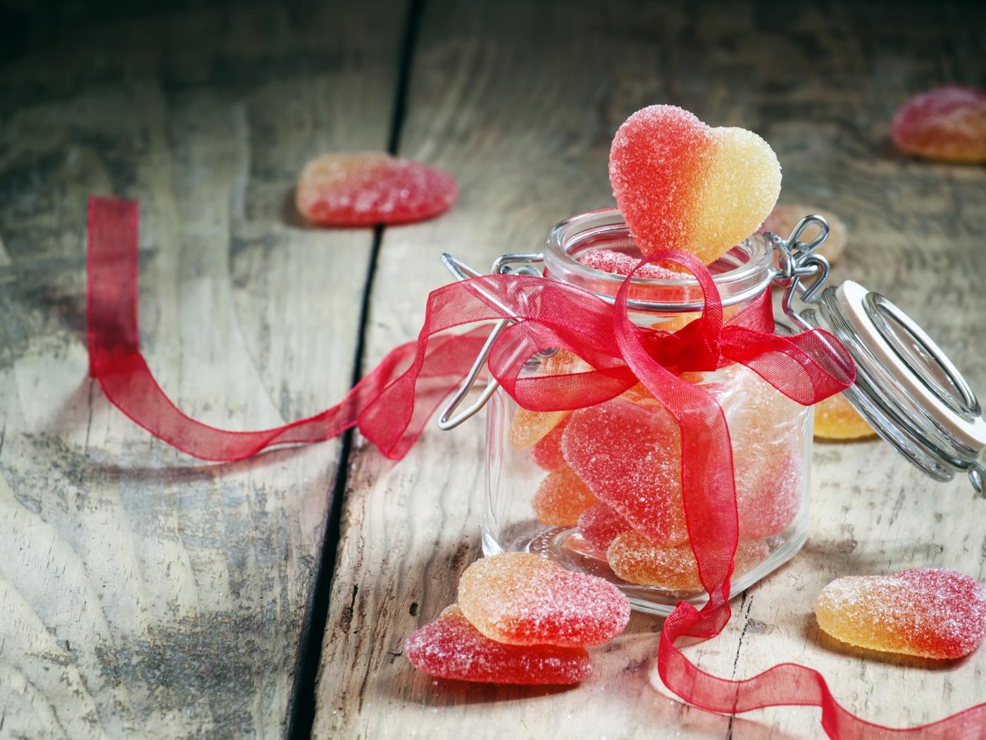 Обои Мармеладные конфеты в форме сердца в стеклянной банке