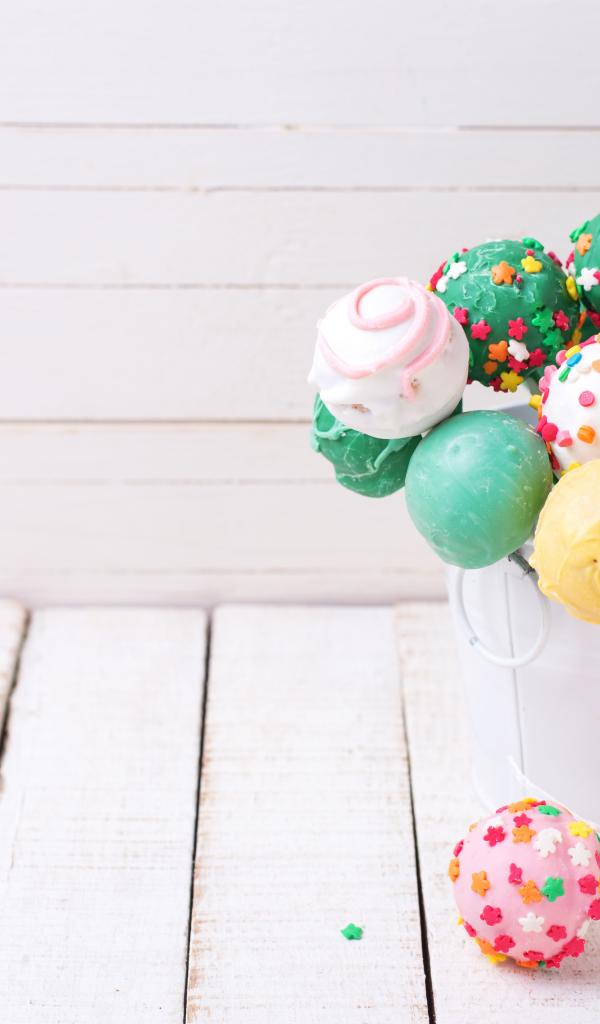 Обои Разноцветные леденцы на палочке в белом ведерке