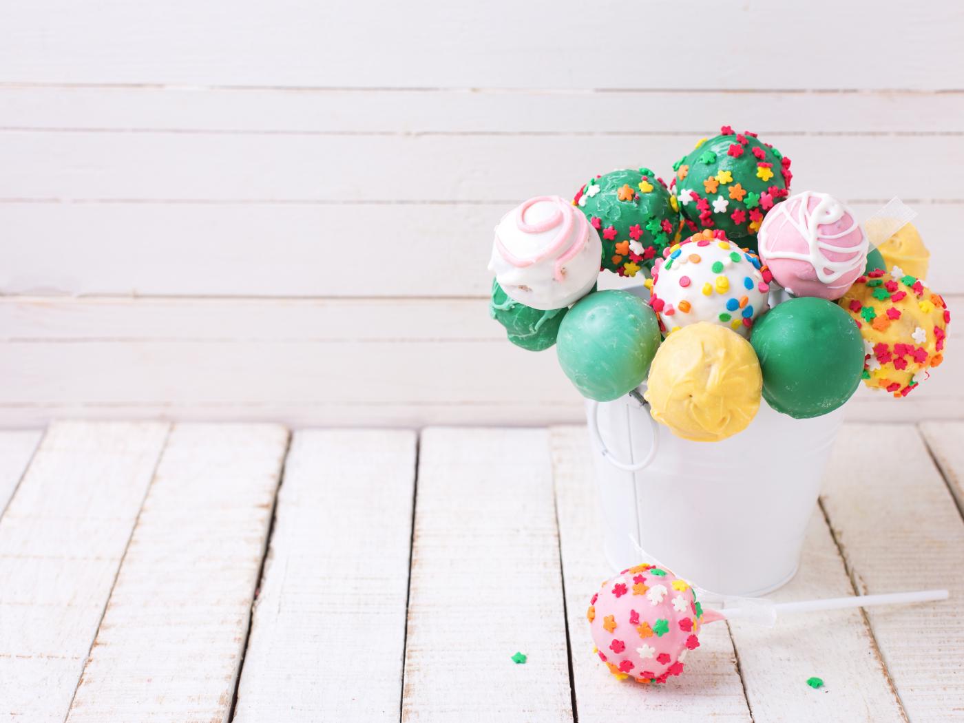 Обои Разноцветные леденцы на палочке в белом ведерке
