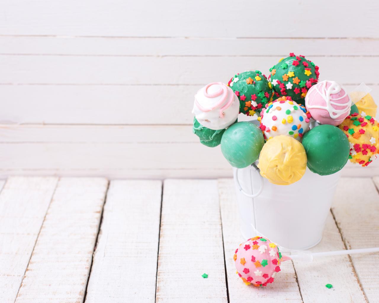 Обои Разноцветные леденцы на палочке в белом ведерке