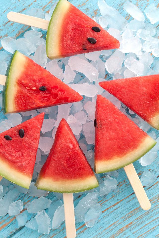 Обои Кусочки арбуза на палочке лежат на льду