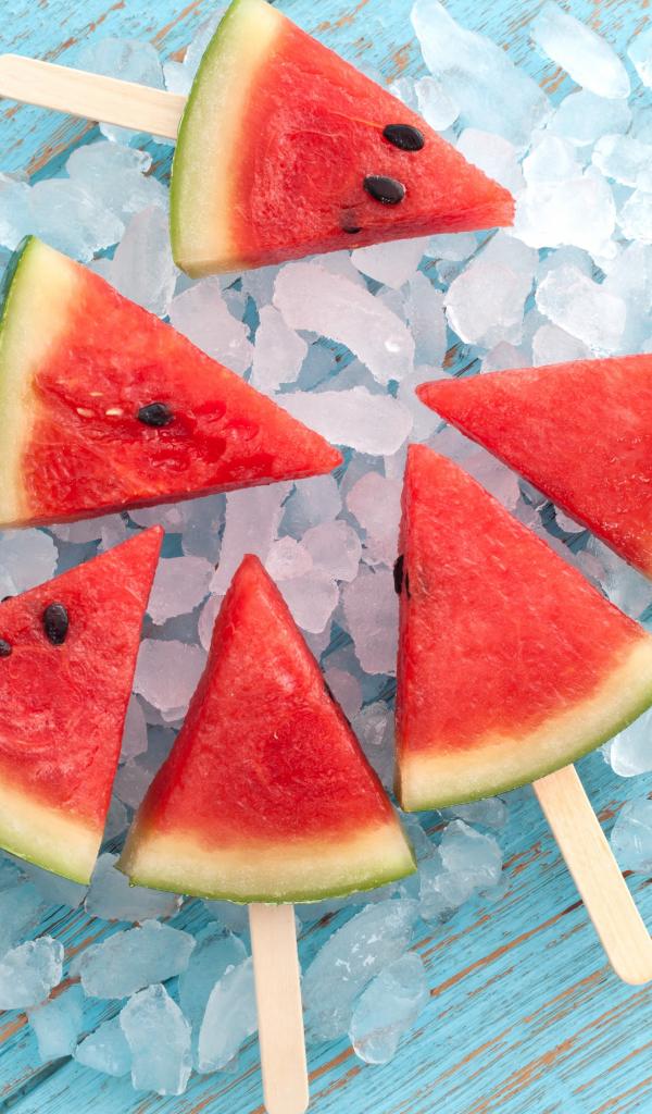 Обои Кусочки арбуза на палочке лежат на льду