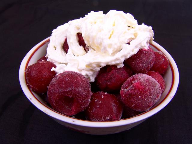 Обои Замороженные черешни к тарелке со сливками