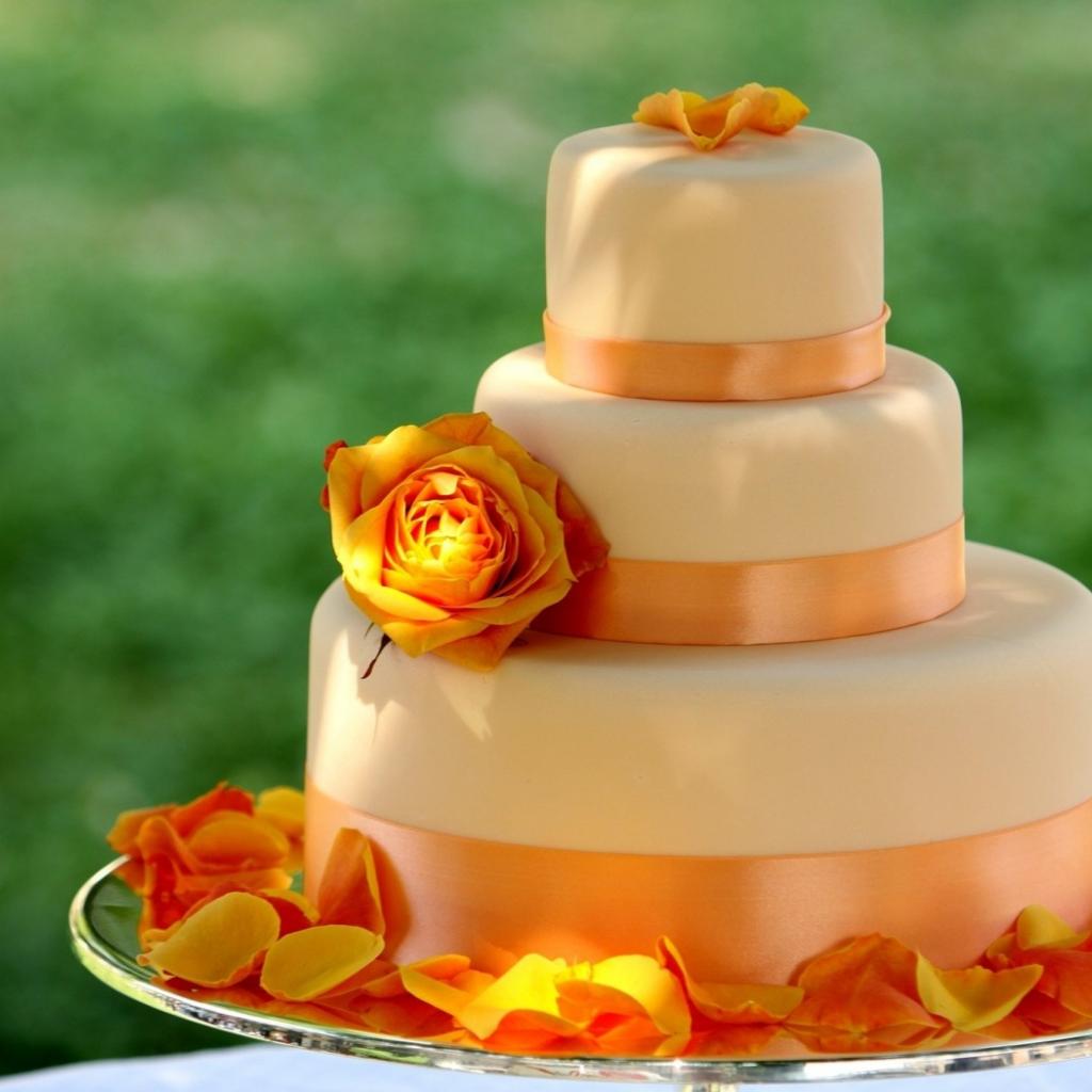 Обои Большой многоярусный оранжевый свадебный торт с цветами