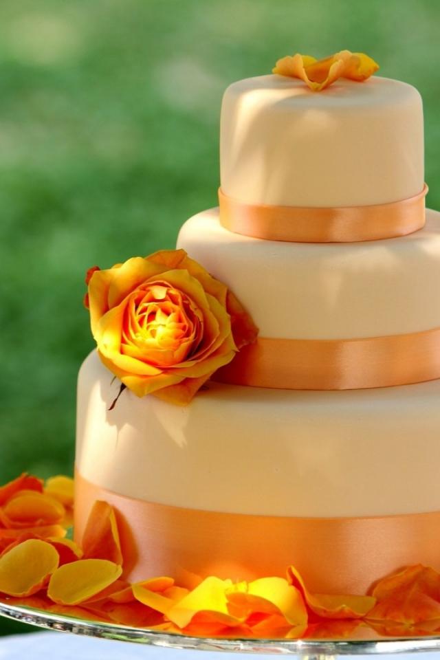 Обои Большой многоярусный оранжевый свадебный торт с цветами