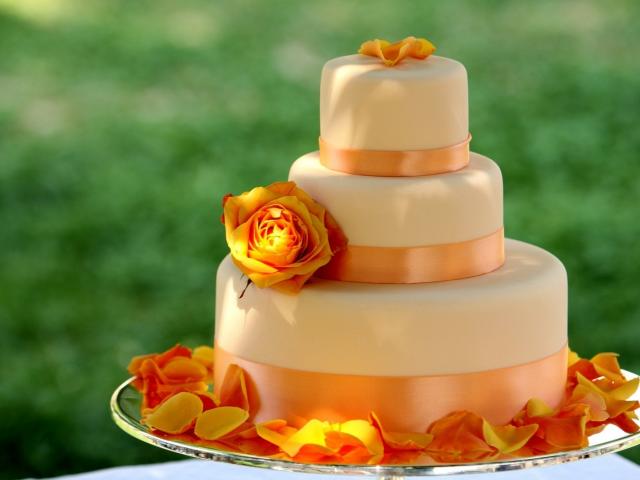 Обои Большой многоярусный оранжевый свадебный торт с цветами
