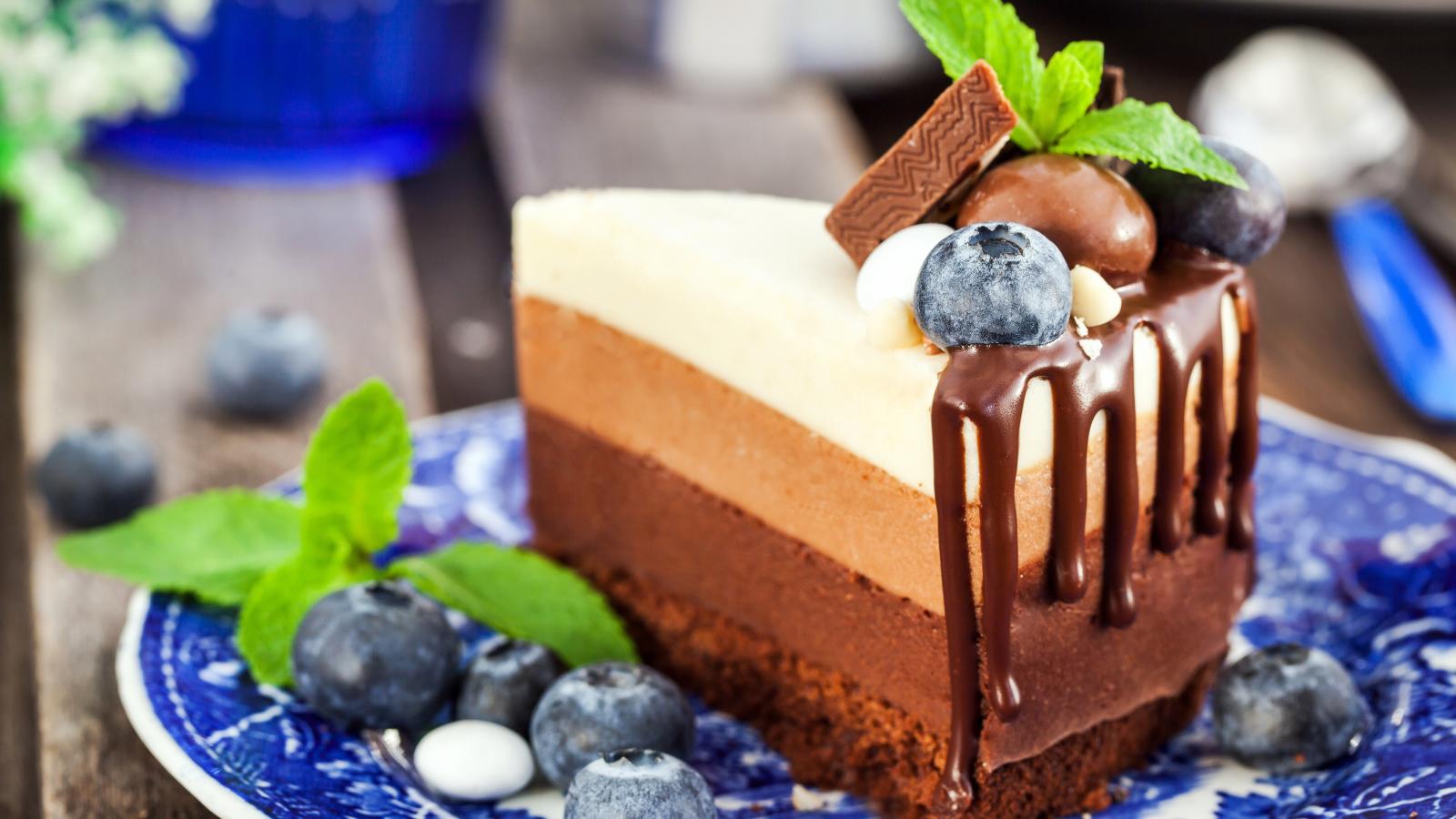 Обои Торт три шоколада с ягодами черники
