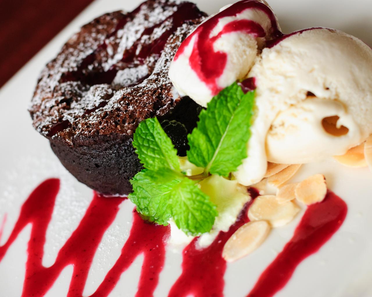 Обои Шоколадное пирожное с мороженым и джемом на тарелке