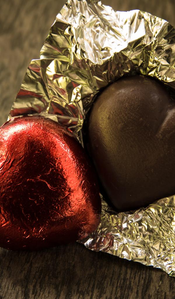 Обои Шоколадные конфеты в форме сердца в блестящей фольге
