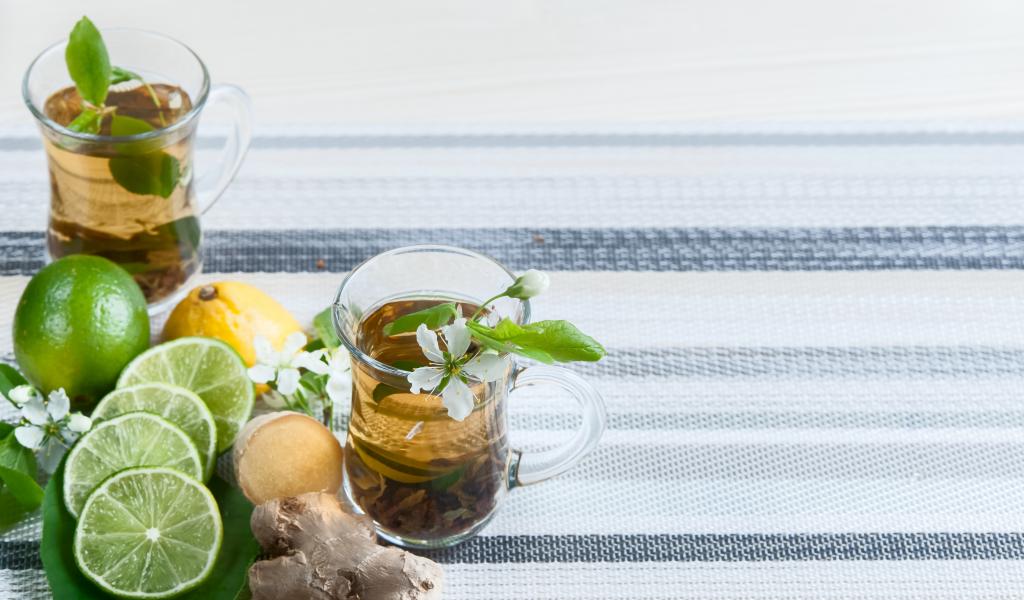 Обои Стеклянные чашки с чаем на столе с имбирем и лаймом