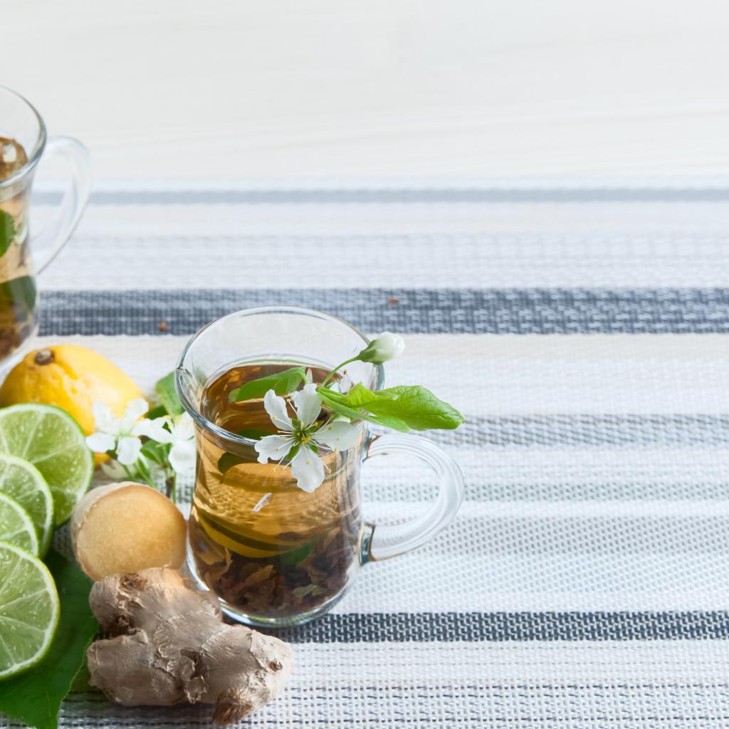 Обои Стеклянные чашки с чаем на столе с имбирем и лаймом