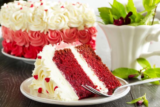 Обои Кусок торта Красный бархат на тарелке с вилкой