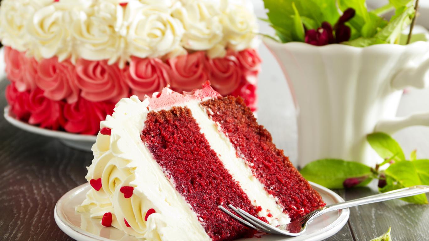 Обои Кусок торта Красный бархат на тарелке с вилкой