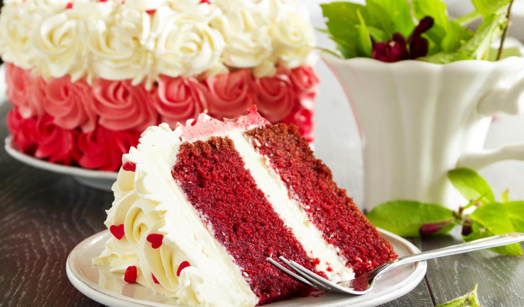Обои Кусок торта Красный бархат на тарелке с вилкой