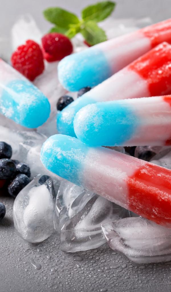 Обои Трехцветное фруктовое мороженое лежит на кусочках льда