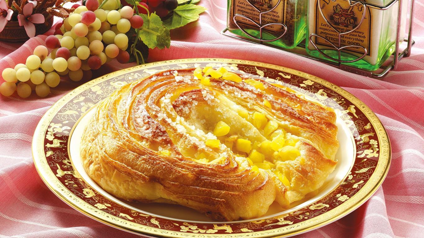 Обои Свежая выпечка с сыром и розовым виноградом на белой тарелке