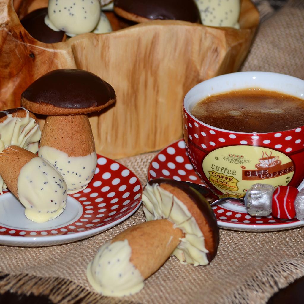 Обои Чашка кофе на столе с печеньем грибочки